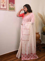 Crafted from fine 100 count Dhonekhali cotton, this saree is a gorgeous fusion of tradition and global flair. The Ukrainian-inspired embroidery lends an artistic and elegant appeal, making it perfect for celebrations and refined gatherings. Both the saree and matching blouse feature detailed machine embroidery, enhancing its luxurious look. Despite its opulent design, it remains comfortable and easy to drape. A glamorous pick for the discerning fashionista.