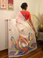 Ichchhapuron's exclusive hand-painted alpona saree features a unique freehand design the artist. Crafted on premium Dhonekhali cotton, this saree blends traditional Bengali art into wearable elegance. Each piece showcases intricate, flowing motifs painted entirely by hand. The colours provide a striking contrast, enhancing the overall aesthetic. This saree is perfect for festive occasions, and makes for a statement piece and a conversation starter. Celebrate the beauty of artisanal craftsmanship with this exclusive creation - a timeless, hand-painted masterpiece that reflects culture, creativity, and individuality. A truly special addition to any wardrobe.