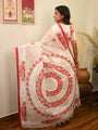 Ichchhapuron's exclusive hand-painted alpona saree features a unique freehand design the artist. Crafted on premium Dhonekhali cotton, this saree blends traditional Bengali art into wearable elegance. Each piece showcases intricate, flowing motifs painted entirely by hand. The colours provide a striking contrast, enhancing the overall aesthetic. This saree is perfect for festive occasions, and makes for a statement piece and a conversation starter. Celebrate the beauty of artisanal craftsmanship with this exclusive creation - a timeless, hand-painted masterpiece that reflects culture, creativity, and individuality. A truly special addition to any wardrobe.