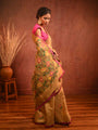 This pure Matka silk saree celebrates Bengal’s proud Jamdani tradition through its elaborately handwoven pallu. The lustrous texture of Matka complements the delicate weaving, creating a stunning contrast of strength and finesse. Its natural sheen enhances the intricacy of the motifs, adding depth and charm. Lightweight and breathable, it drapes elegantly, suitable for both festivities and celebratory events. The blouse piece in running length offers styling flexibility. A true confluence of texture and artistry, this saree encapsulates Bengal’s timeless weaving heritage in refined contemporary expression.